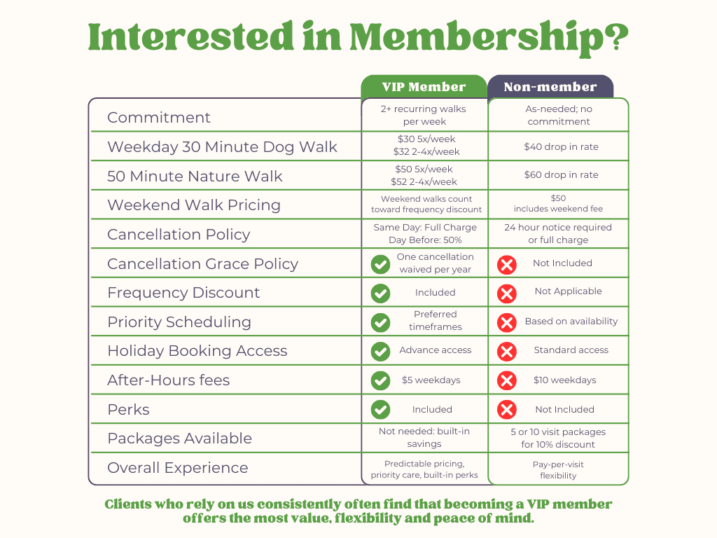 We want membership to stay fair for clients who consistently schedule two or more walks per week — while still being flexible when life gets busy. No awkward conversations, we promise! We will reach out first and adjust if your needs change.